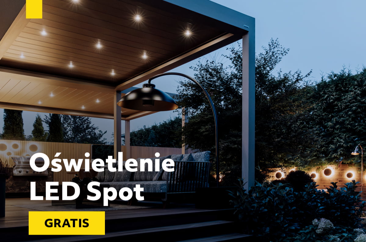 Oświetlenie jest praktycznie elementem must have każdej tarasoli. Teraz możesz otrzymać je za darmo. Spoty LED objęte promocją liczymy wg standardów Tarasola, czyli 1 Spot LED/ 1,5 mkw zadaszenia. Szczegóły promocji znajdziesz w regulaminie.